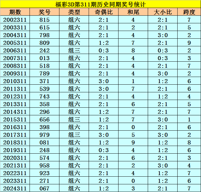 福彩3D历年第311期同期奖号为:815 615 798 809 242 013 518 789 371 539 743 358 296 656 398 979 081 248 574 958 923 271 067。