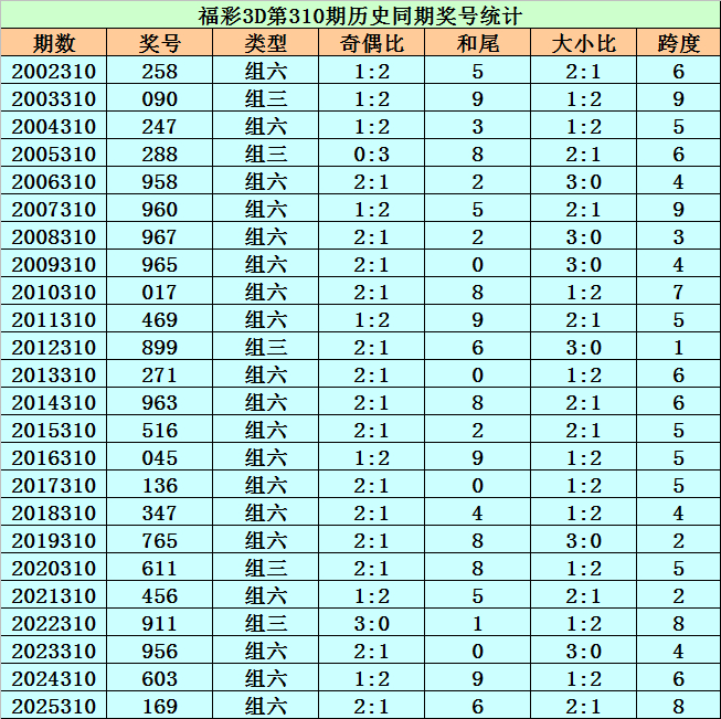 福彩3D历年第310期同期奖号为:258 090 247 288 958 960 967 965 017 469 899 271 963 516 045 136 347 765 611 456 911 956 603 169。