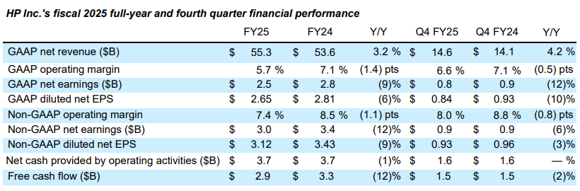 展望未来,惠普预计,对于2026财年,不计入重组费用等项目的全年利润预计为每股 2.90 美元至 3.20 美元,而分析师平均预期为每股 3.32 美元。惠普预计,对于截至 1 月的第一财季,扣除项目后的每股收益为 73 美分至 81 美分,而中值略低于分析师平均预期78 美分。